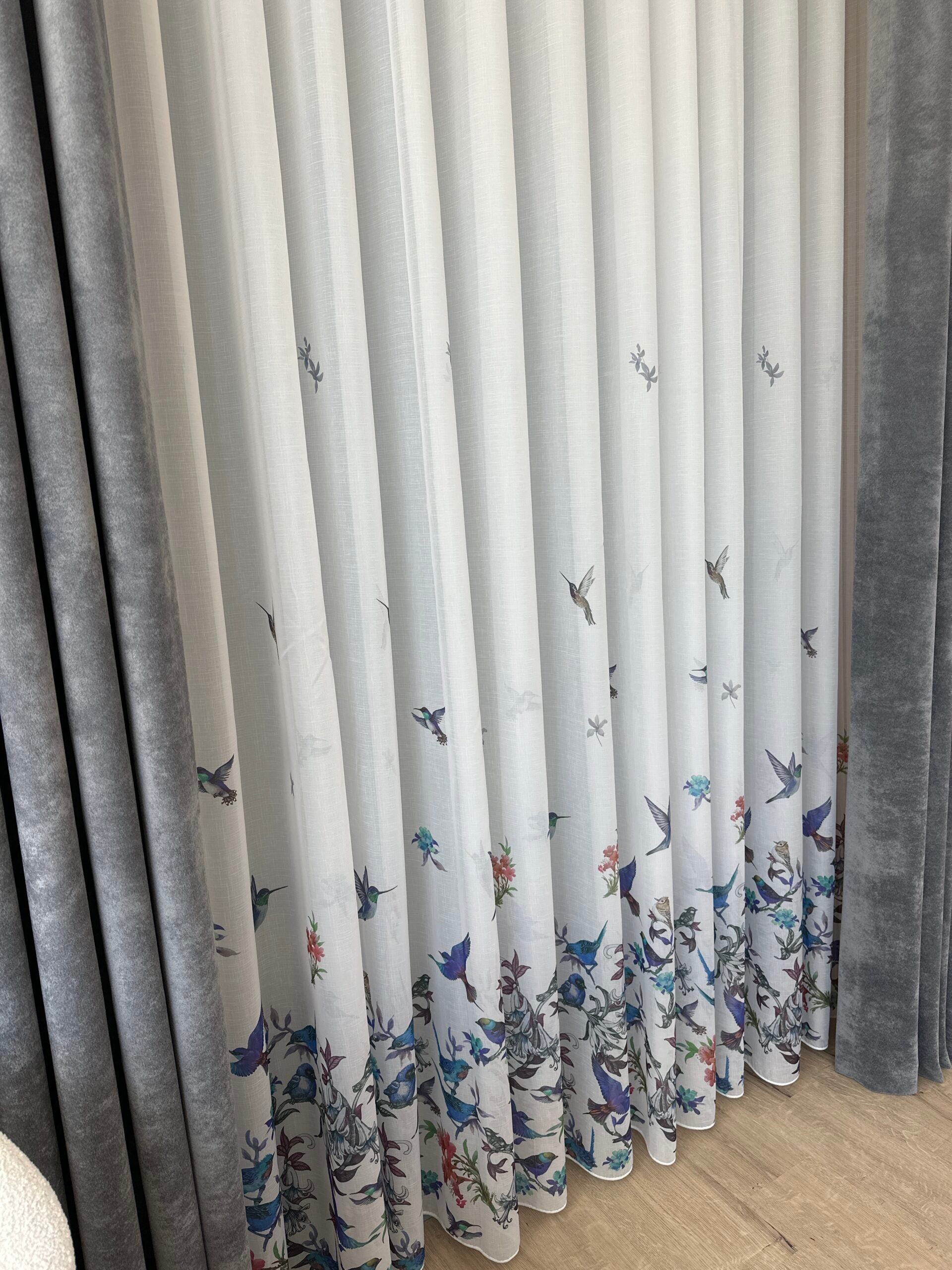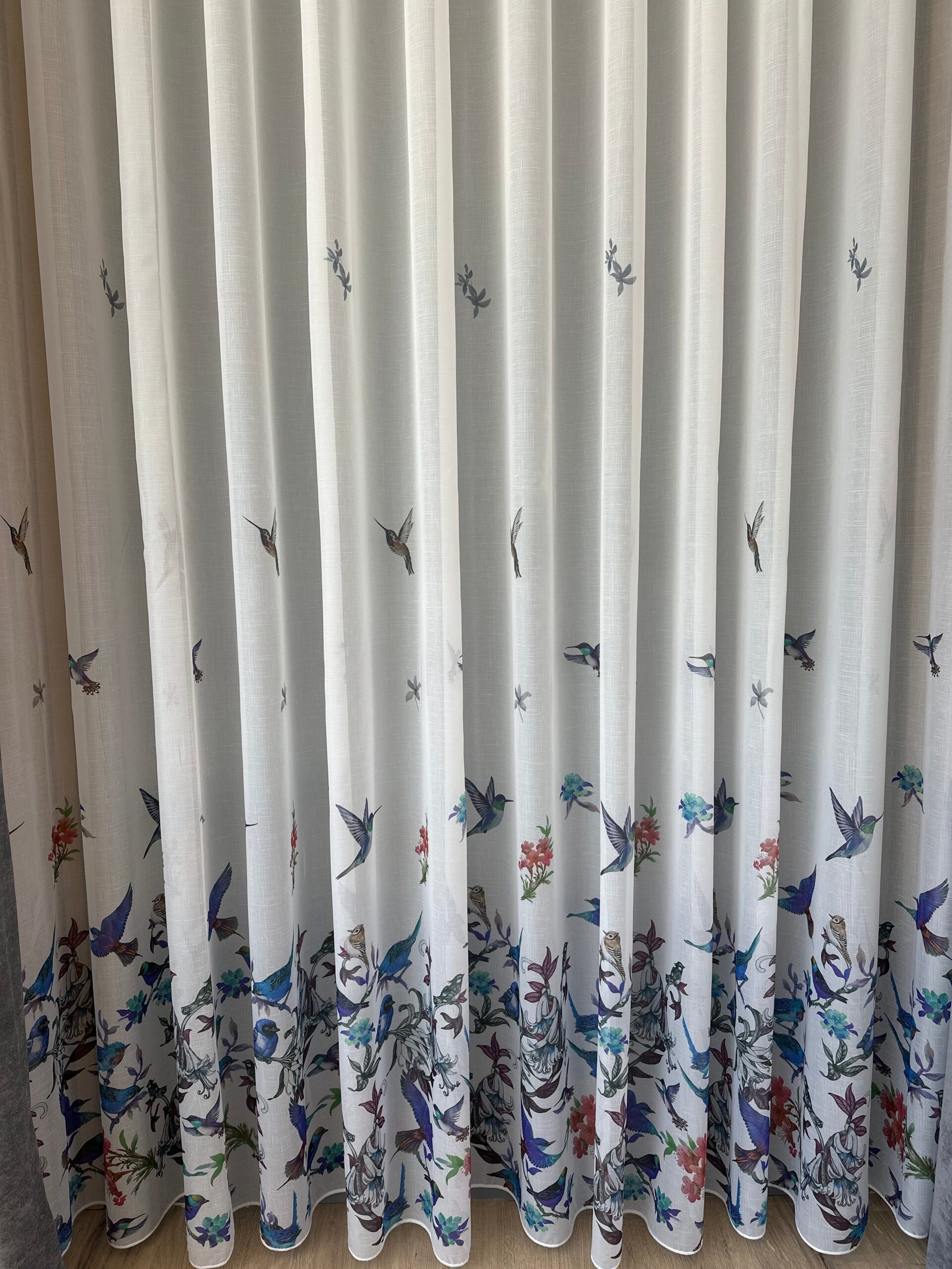Perdea alba cu accente albastre, imprimeu de pasari și flori – model natural, realizata la comanda