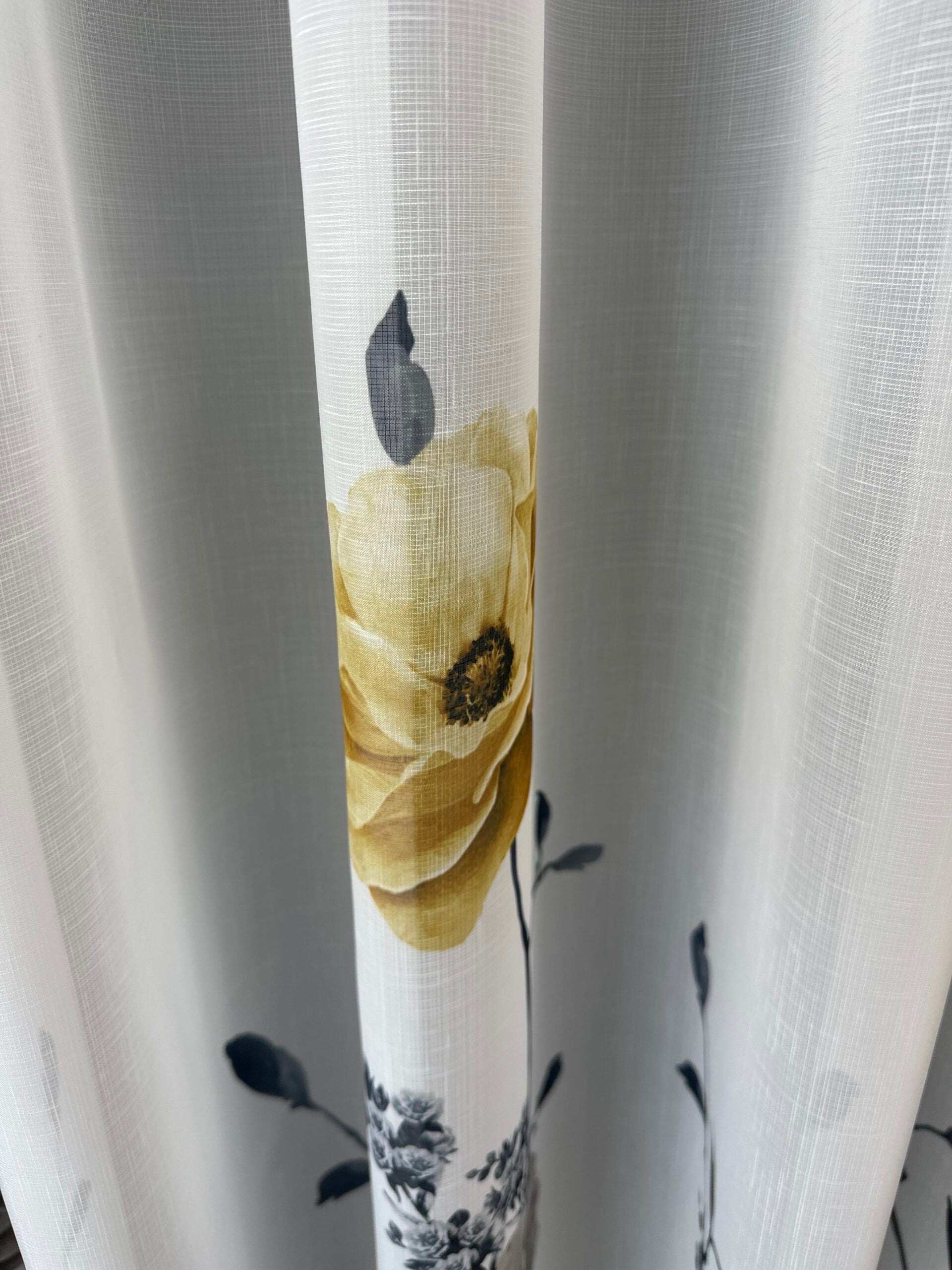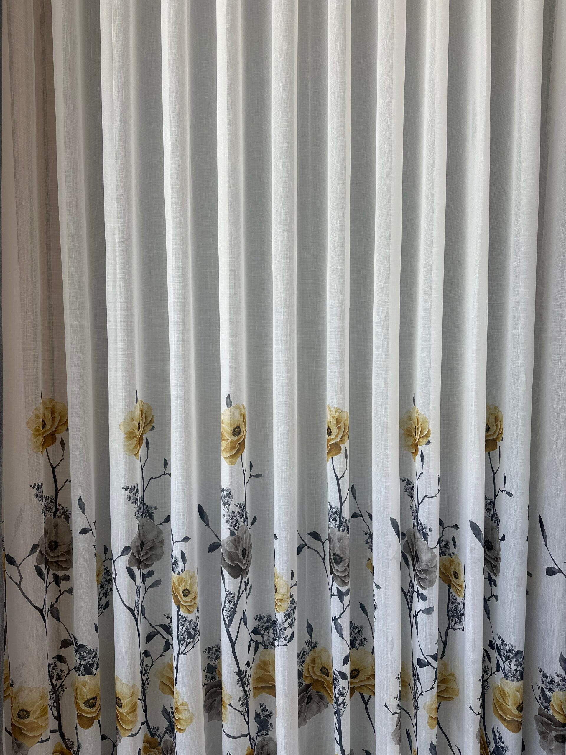 Perdea Albă cu Imprimeu Floral – Nuanțe de Galben Muștar și Gri