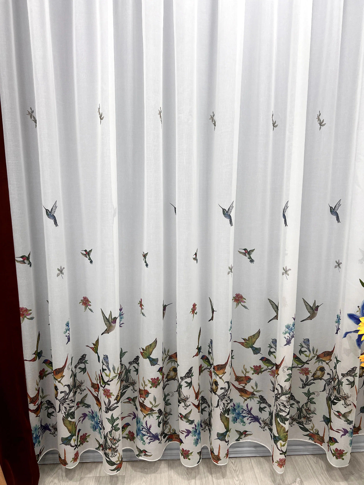 Imprimeul este poziționat discret în partea inferioară a perdelei, cu păsări colorate și flori fine, lăsând partea superioară aerisită și luminoasă. Materialul semitransparent permite pătrunderea luminii naturale, oferind în același timp intimitate.